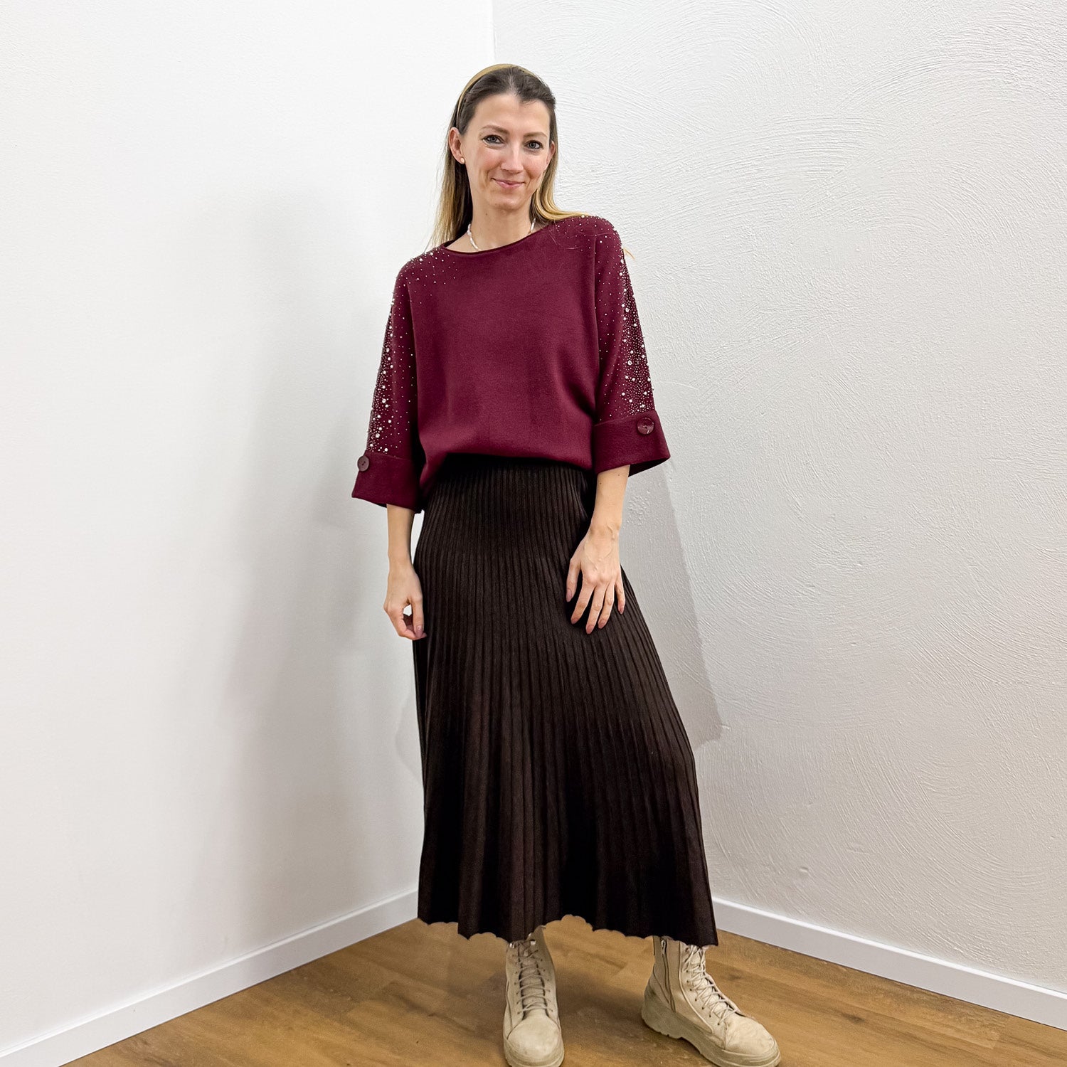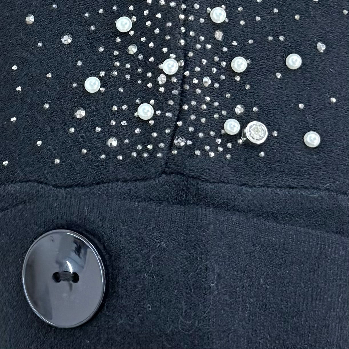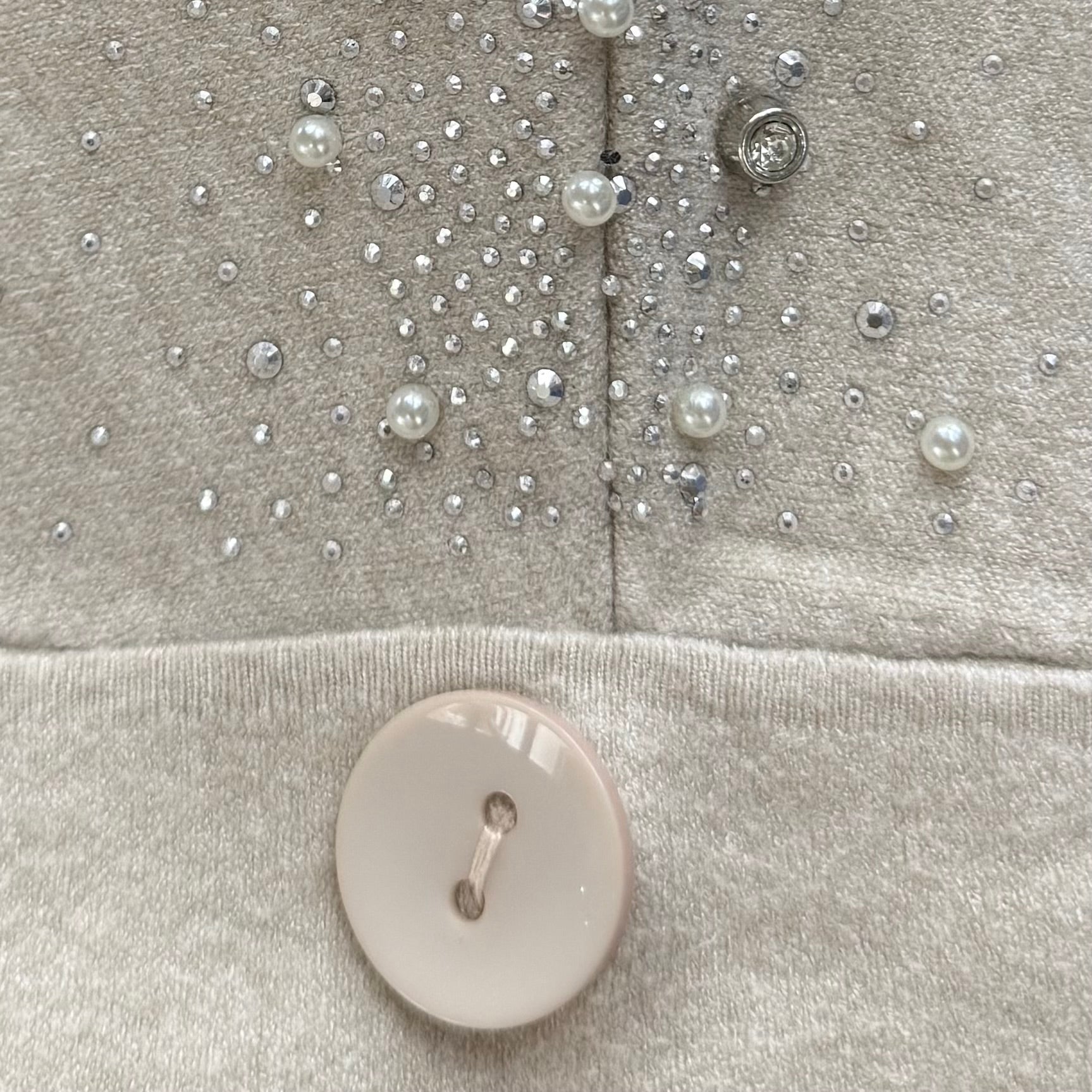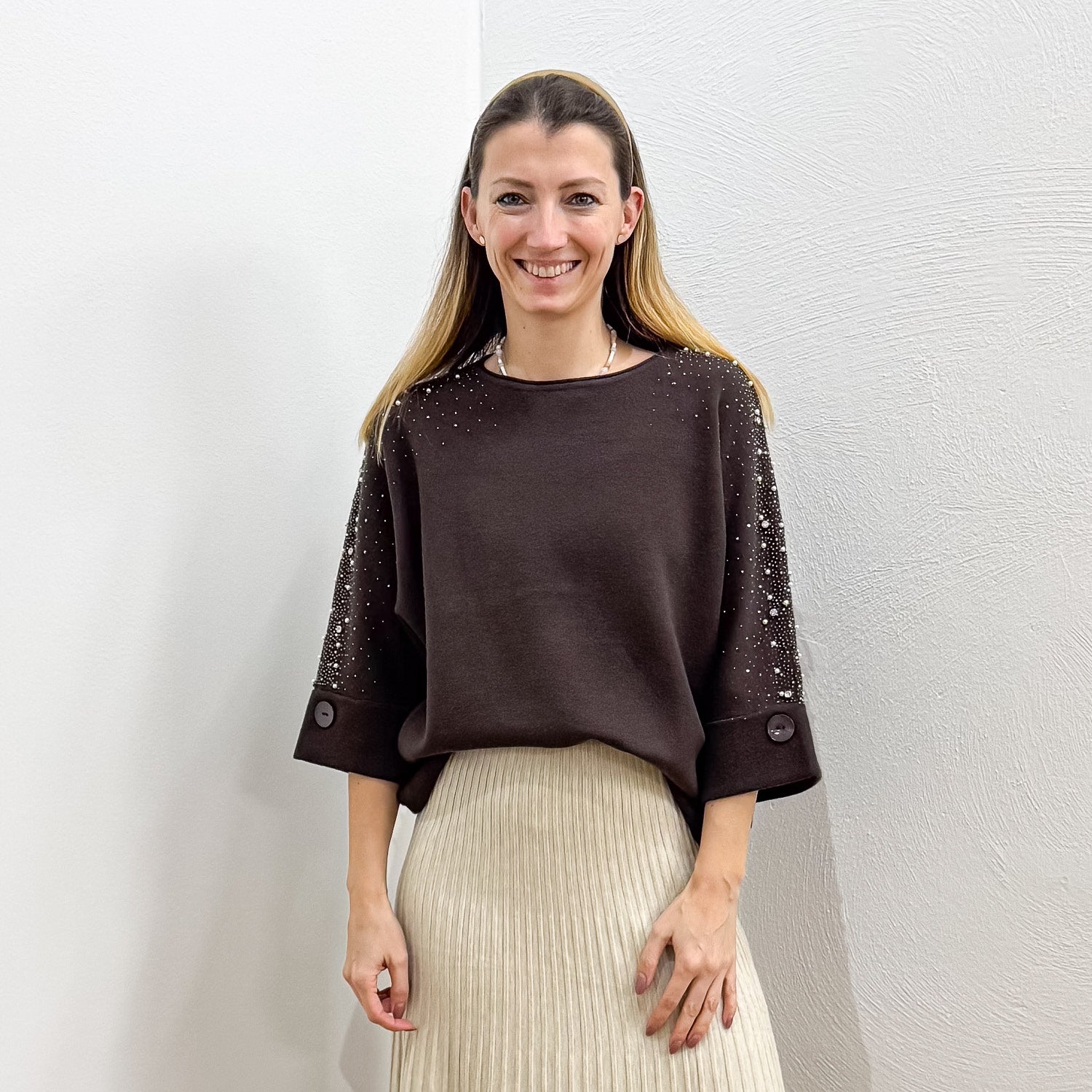 Weicher und fließender halbarm Pullover mit Perlen und Strasssteinchen.
