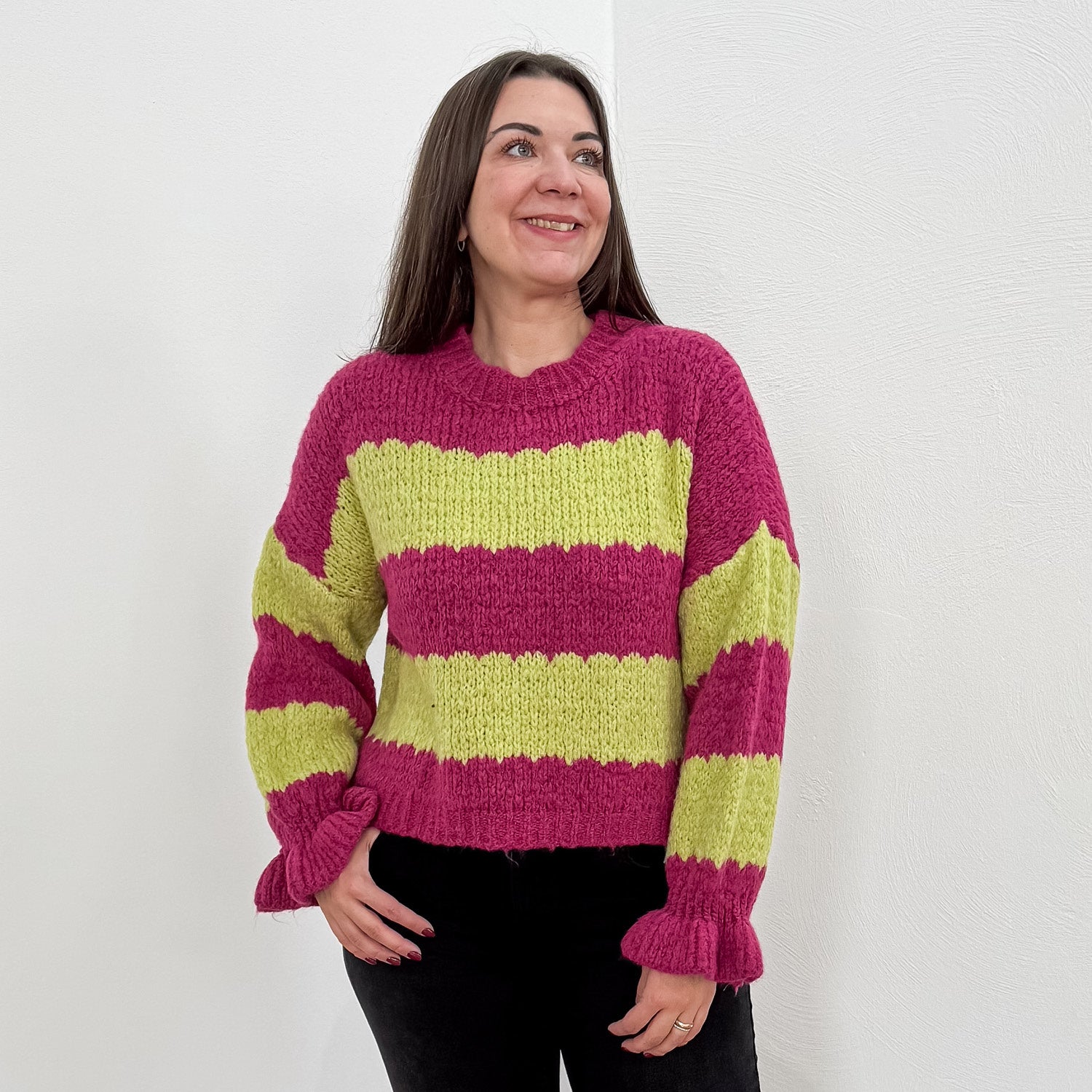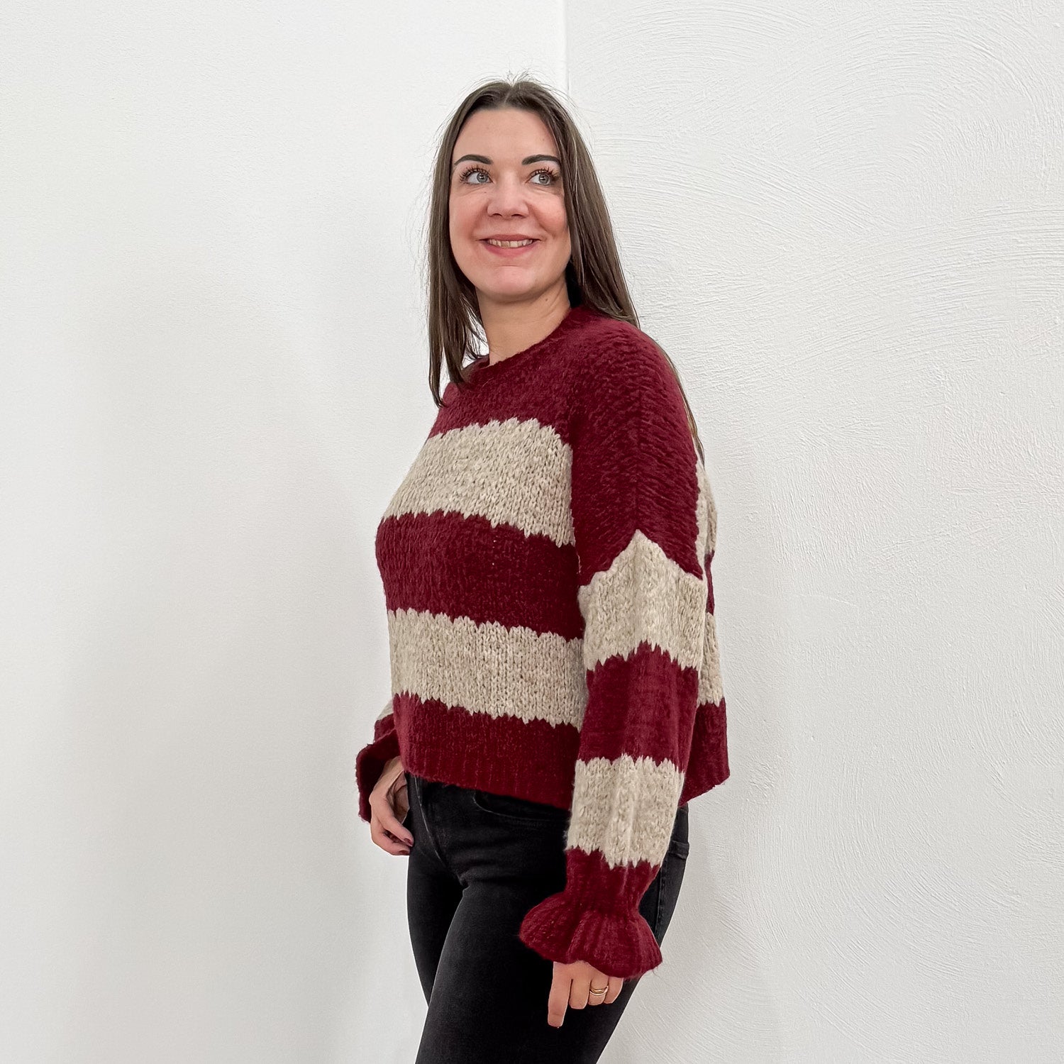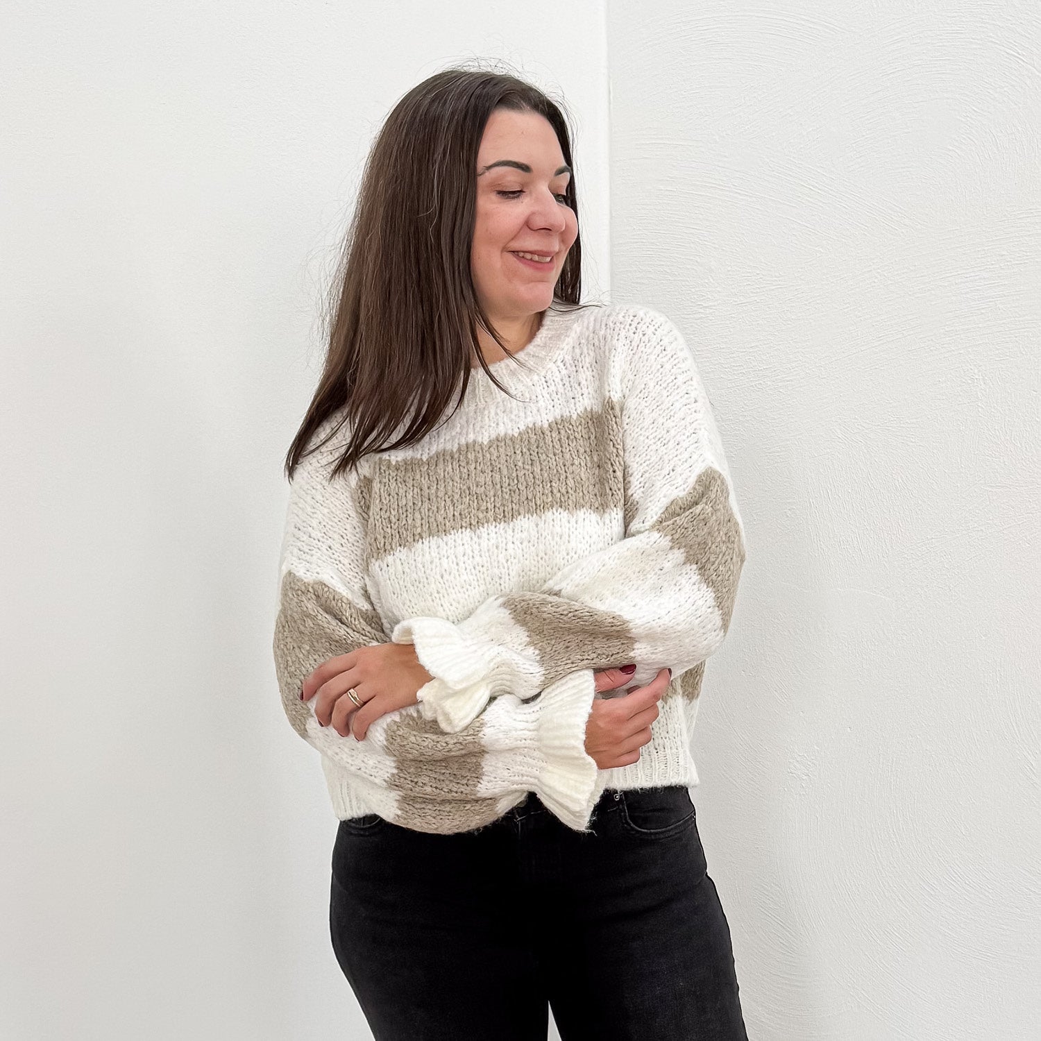 Ultraweicher Pullover mit Streifen und Trompeten-Ärmeln.
