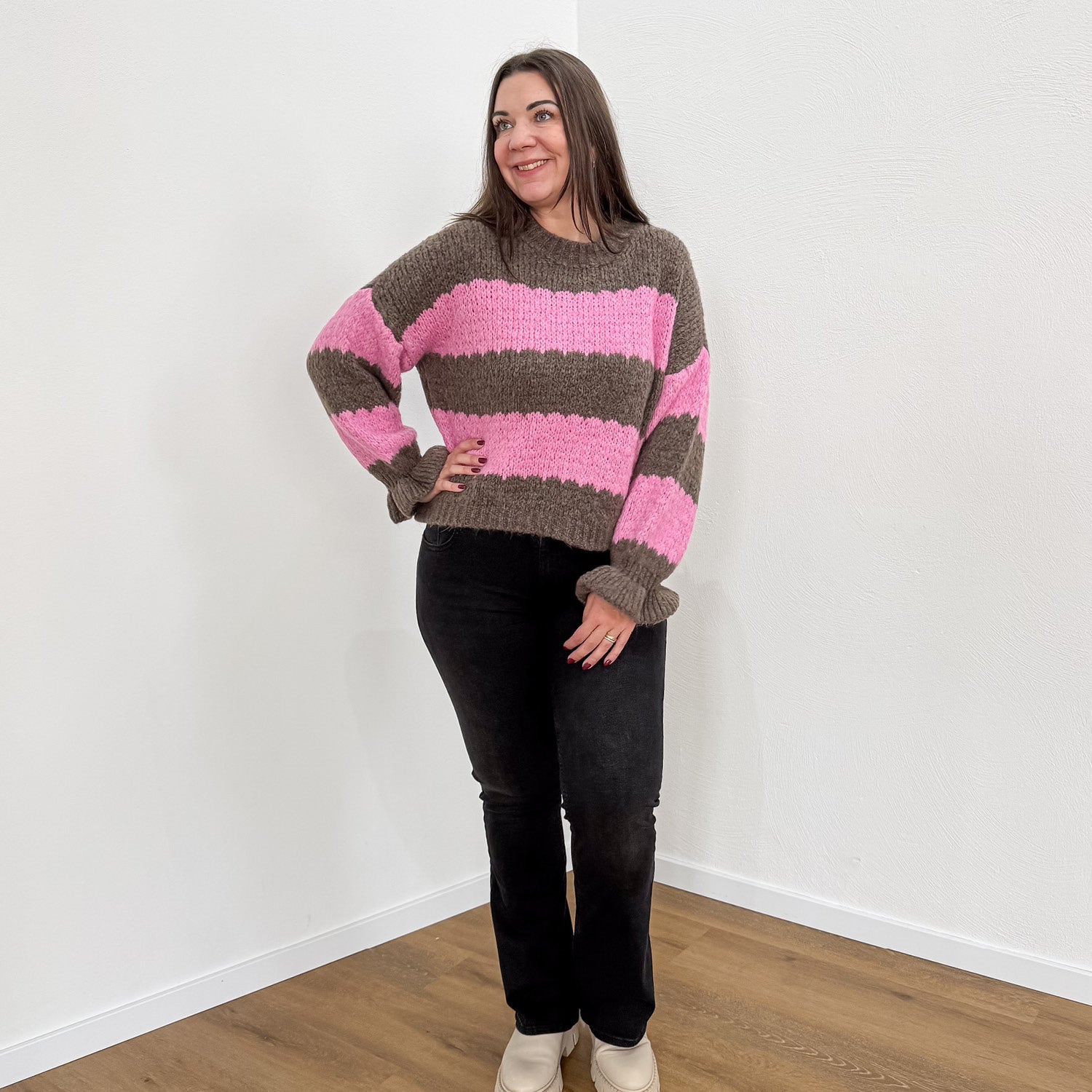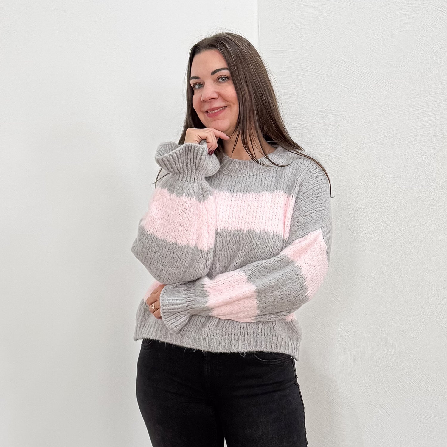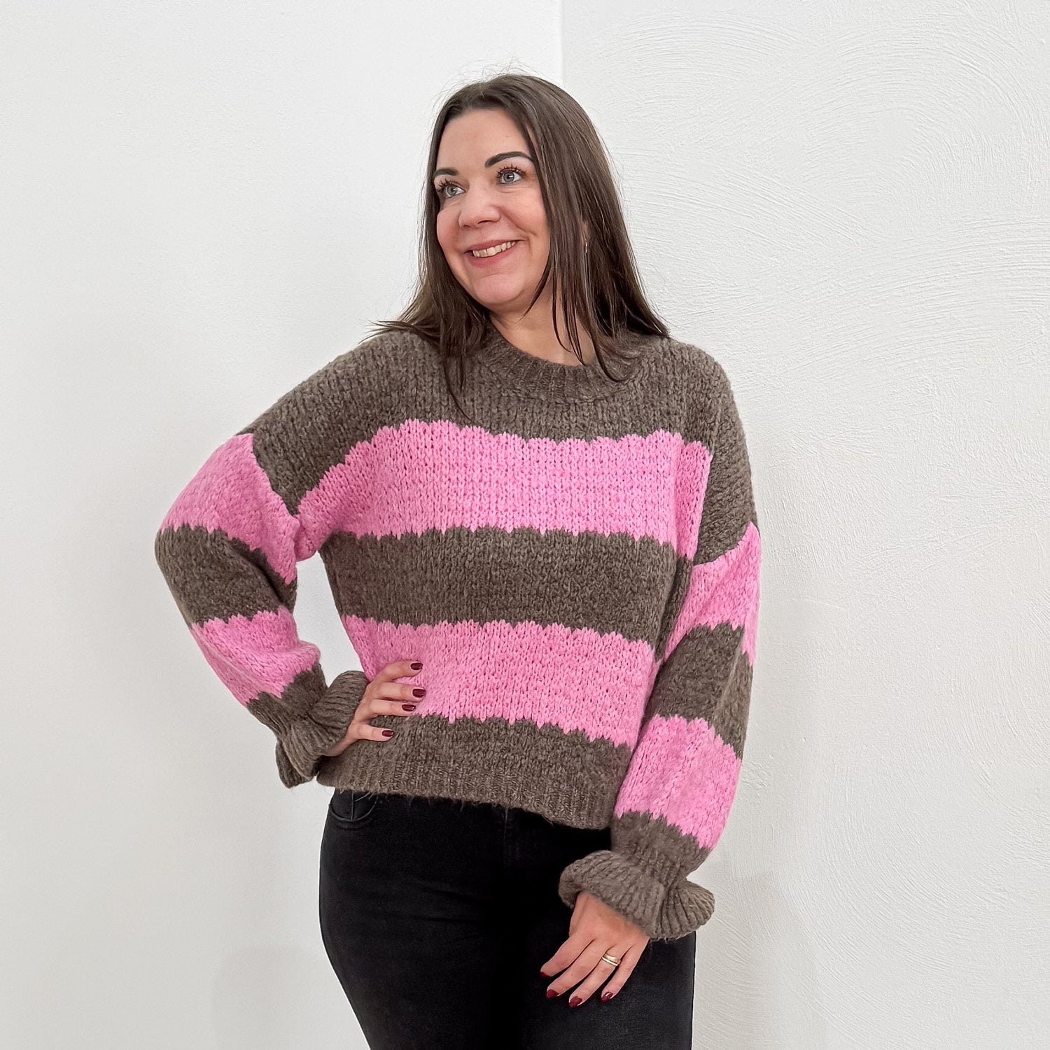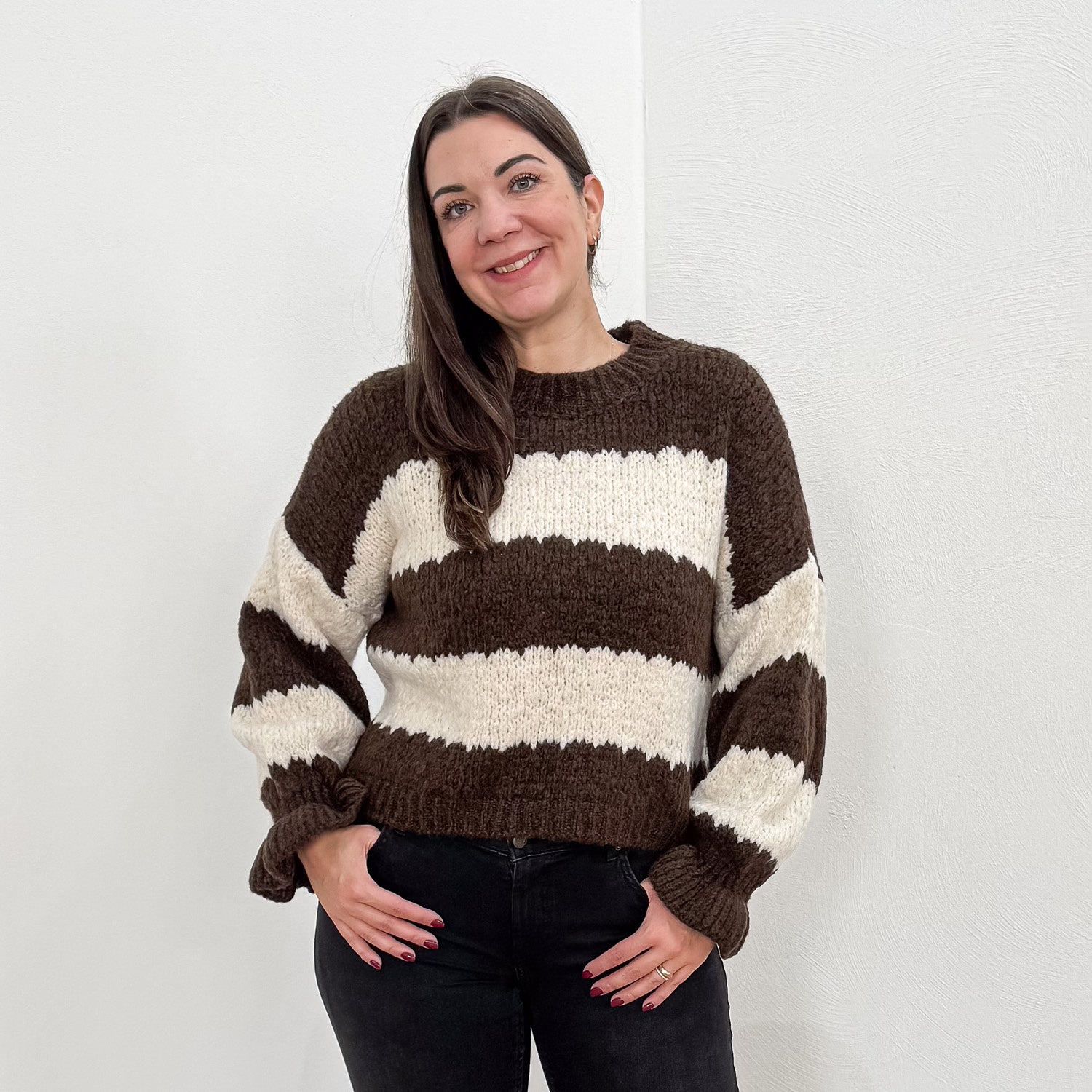 Ultraweicher Pullover mit Streifen und Trompeten-Ärmeln.