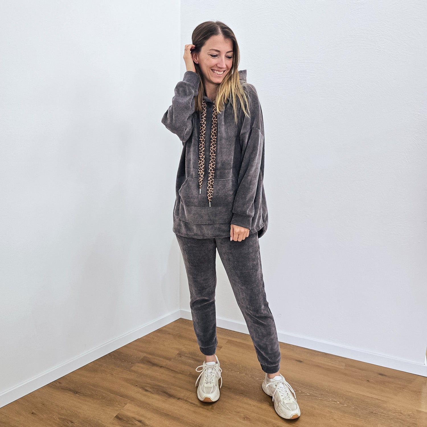 Kuschelig, weiches Set mit Leo-Bändel an Pullover und Hose. Mit Greiftaschen.