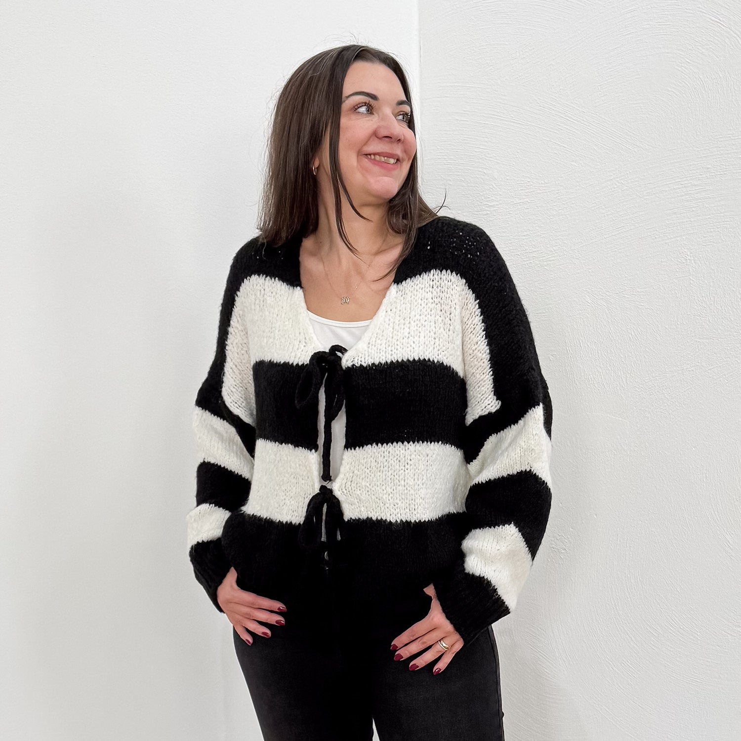 Kuschelige Strickjacke mit Streifen und Bindeschleifen.