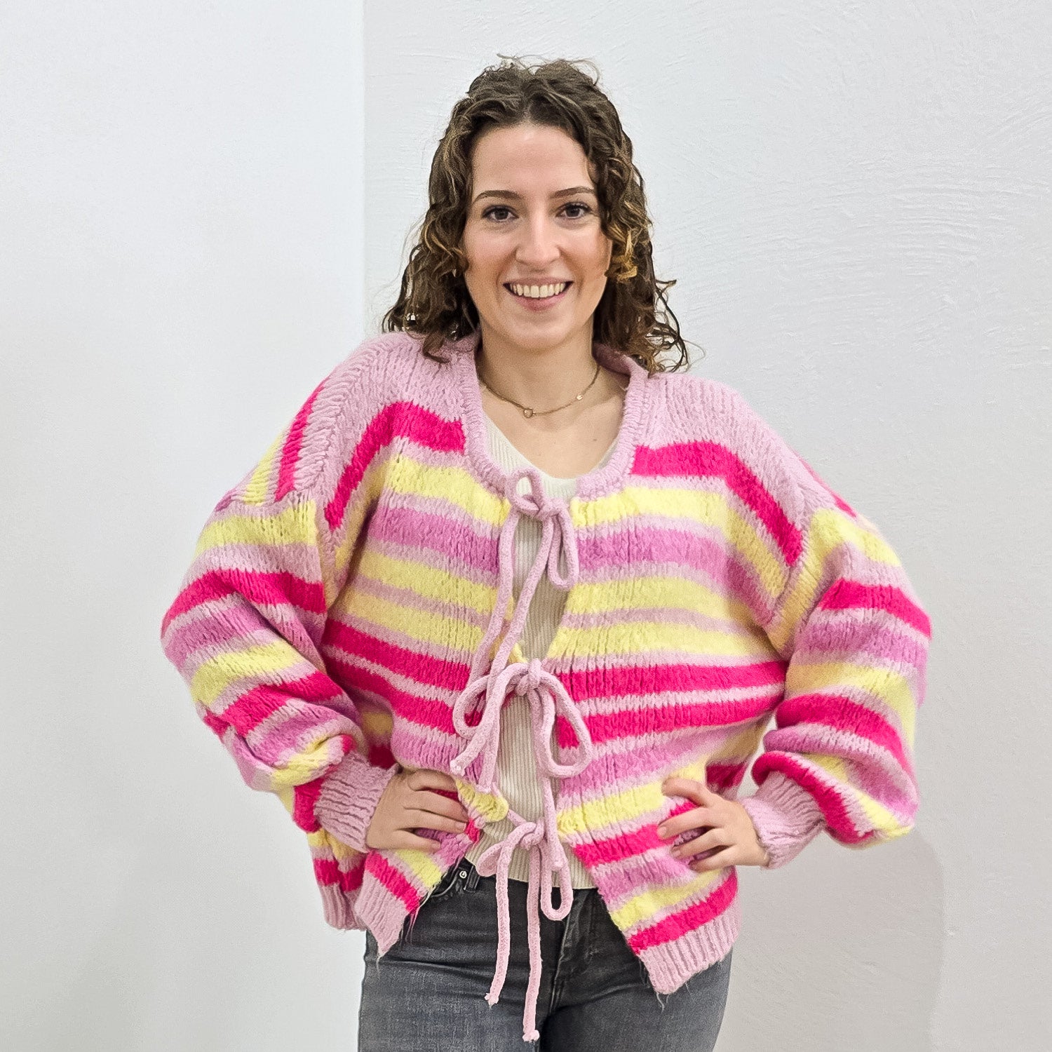 Knallige und weiche Strickjacke mit Bindeschleifen.